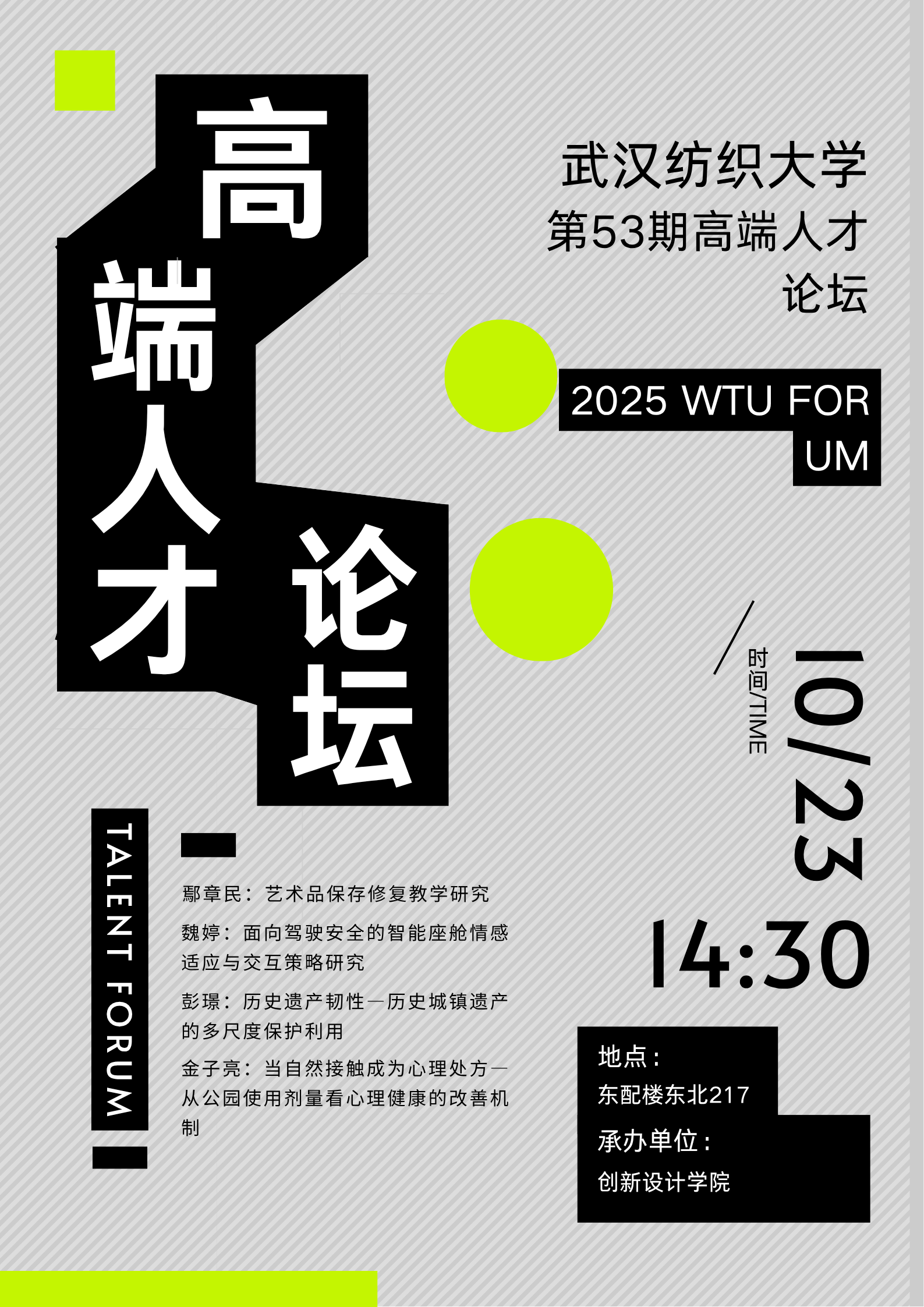 2025年10月23日,武汉纺织大学第53期高端人才论坛在东配楼东北217会议室如期举行。本次论坛由创新设计学院承办,全体教师出席。论坛由院长石元伍主持。
