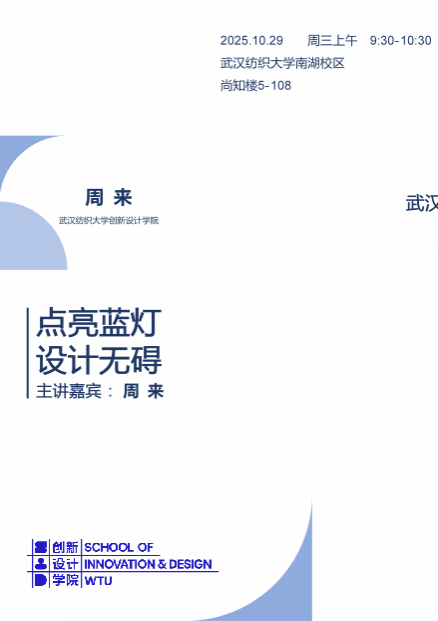 为提高青年学生公益服务责任意识,加强对特殊群体的理解与关怀。10月29日上午,武汉纺织大学创新设计学院在南湖校区尚知楼5-108教室,举办了以“点亮蓝灯 设计无碍”为主题的本科生公益设计讲座,本次讲座由学院教师周来担任主讲嘉宾,2025级全体新生参与。