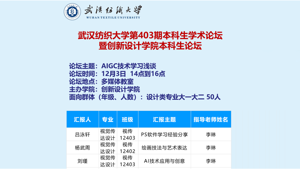 12月3日下午,武汉纺织大学第403期本科生学术论坛,由创新设计学院师生在武汉纺织大学(南湖校区)NH东北-501教室举行,2024级、2025级部分学生参加了本届论坛。
