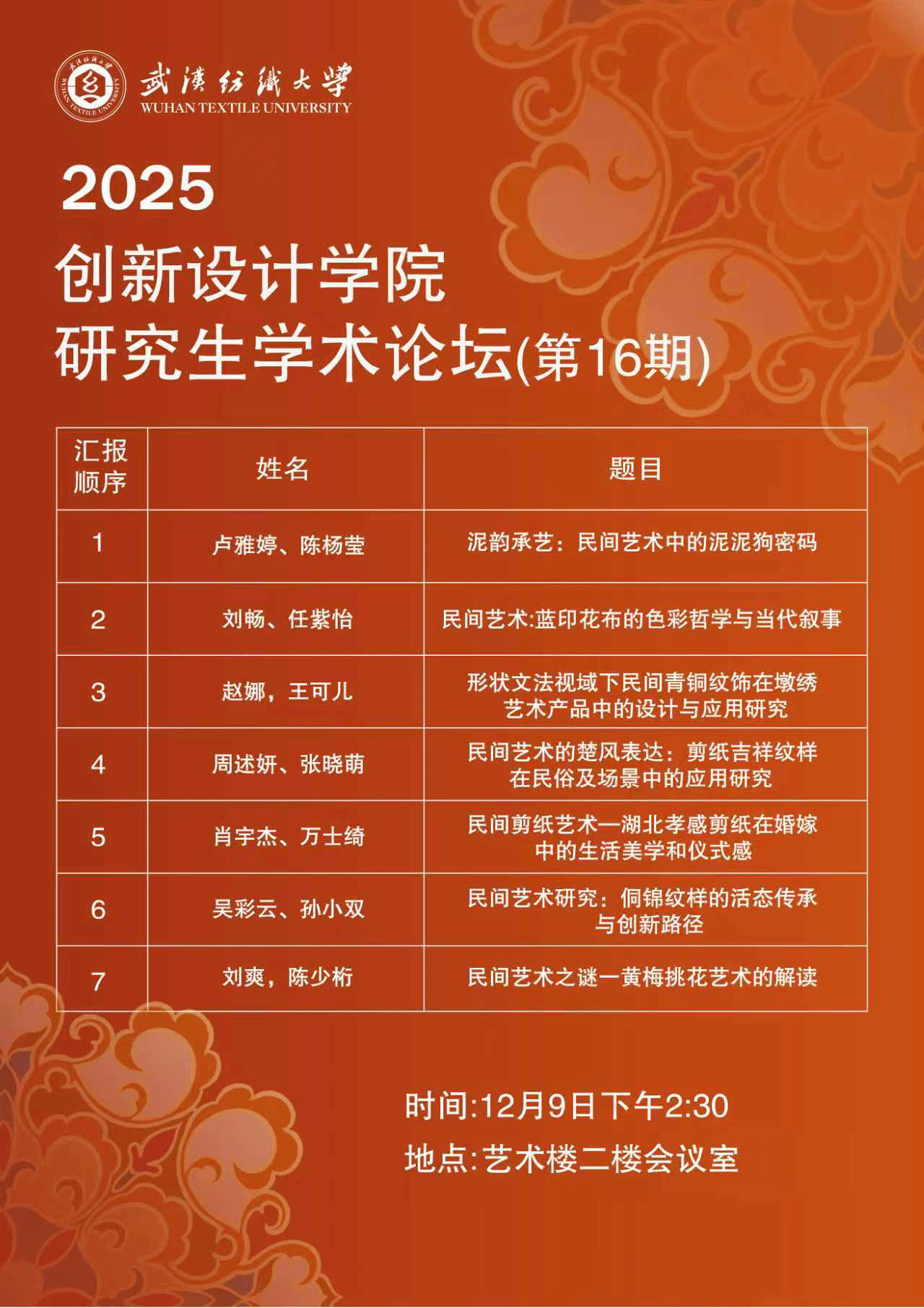 12月9日,武汉纺织大学创新设计学院2025年第16期研究生学术论坛在艺术楼二楼会议室顺利召开,此次论坛由伍云秀老师主持,7组研究生依次登台汇报,借助高清影像、动态图谱以及实物纹样等PPT的形式进行演示,内容主要围绕泥泥狗、蓝印花布、青铜纹饰、剪纸、侗锦、黄梅挑花等民间艺术为核心,从色彩哲学、符号转译、生活美学、活态传承、创新路径等维度展开深度剖析。