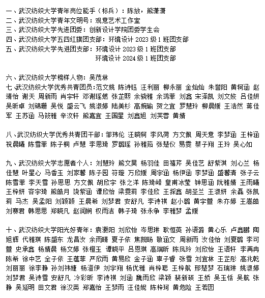 根据《武汉纺织大学共青团“五四评优”办法》规定,经个人申报,学院初评,择优产生向校团委推报的集体和个人,现将名单公示如下: