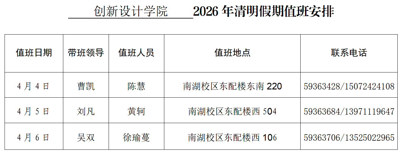 创新设计学院2026年清明假期值班安排