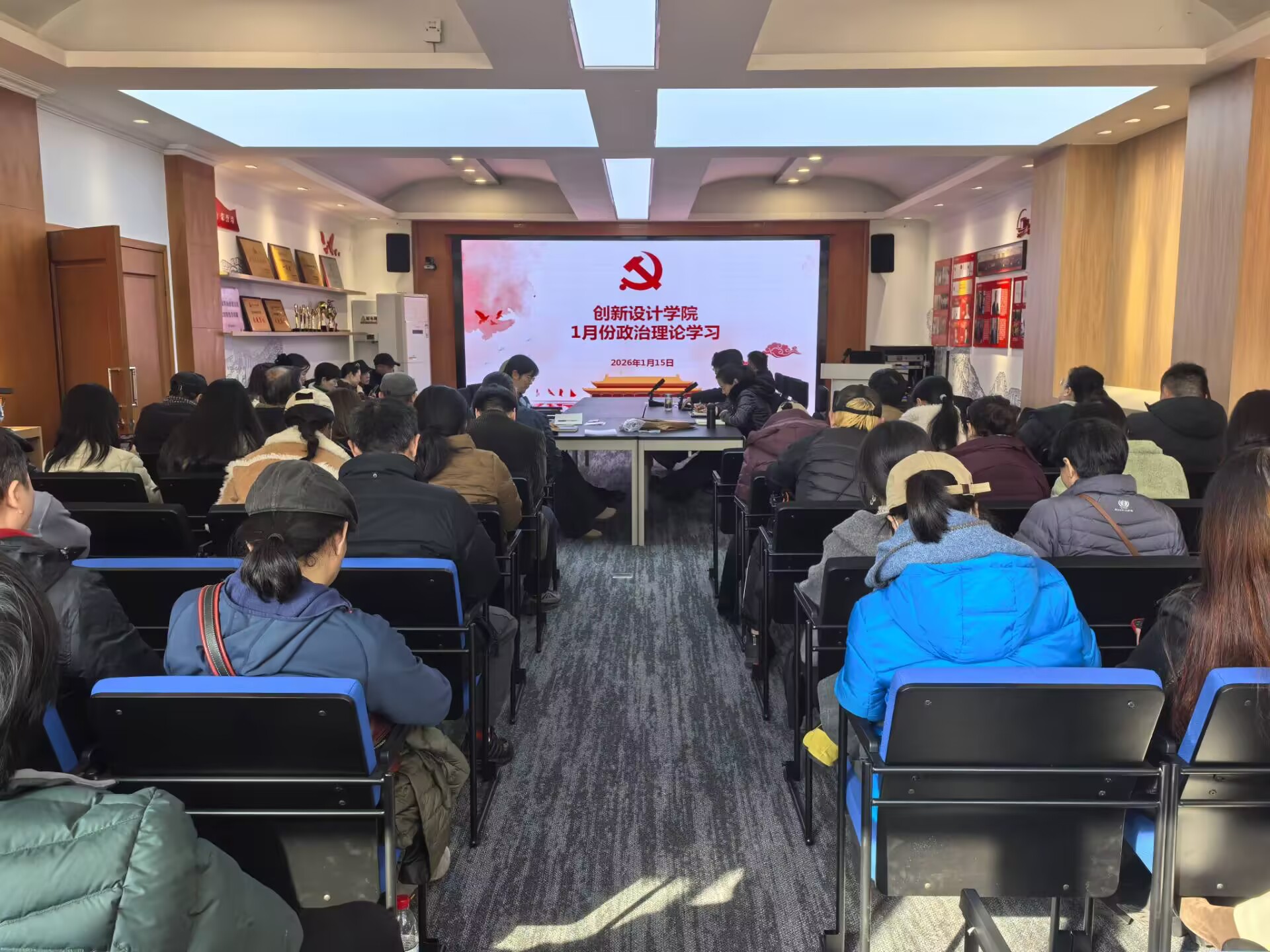 1月15日下午,创新设计学院在学院会议室开展1月份政治理论学习,学院党委书记刘元文主持本次会议。学院党委副书记吴双领学了国家主席习近平发表二〇二六年新年贺词、《扩大内需是战略之举》、促进高质量充分就业(2025-12-15《人民日报》)等重要内容,全体教职工参加学习。