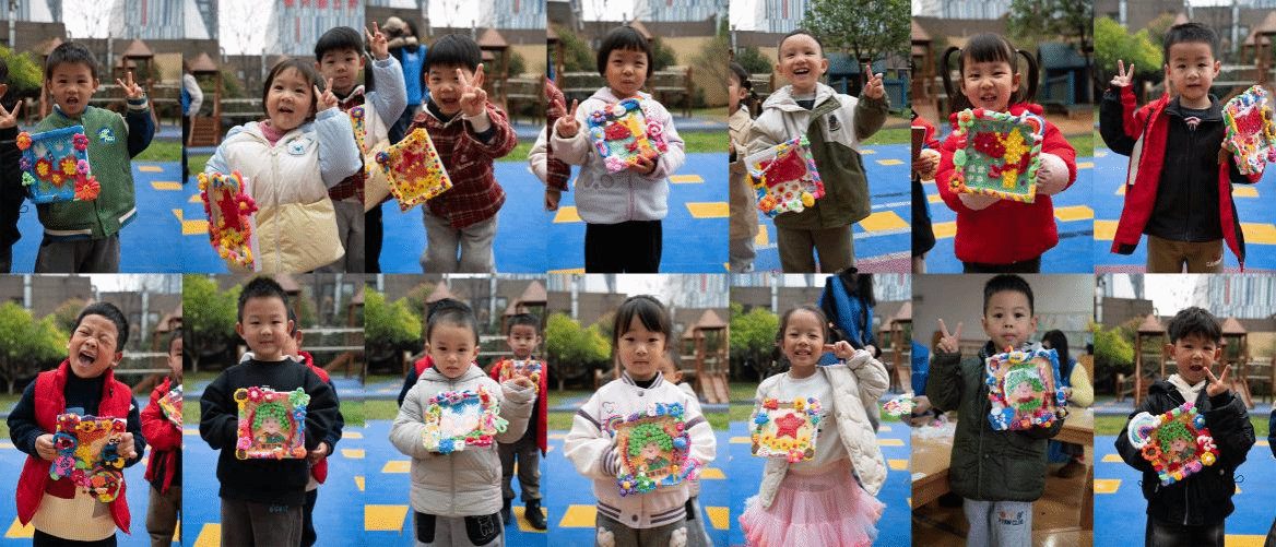作品完成后,孩子们纷纷展示自己的手工相框,脸上洋溢着喜悦的笑容。活动尾声,全体幼儿与党员志愿者合影留念,孩子们带着亲手制作的作品满载而归,党员志愿者们主动整理场地、清理材料,以实际行动践行志愿服务精神。