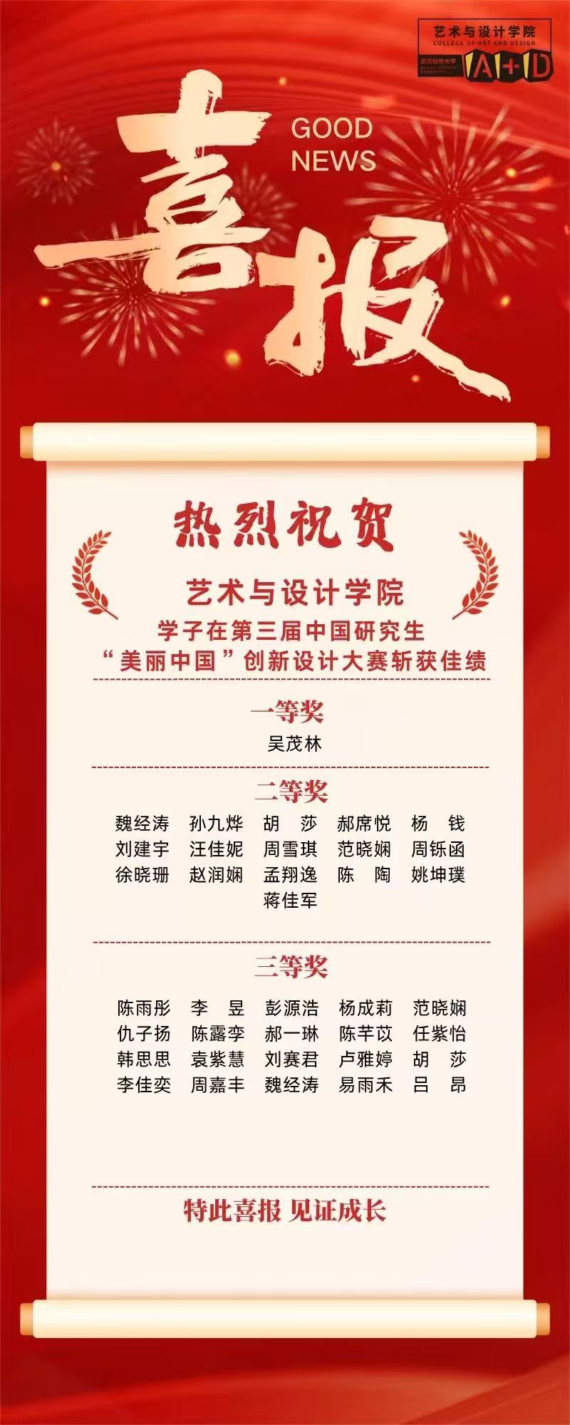 近日,第三届中国研究生“美丽中国”创新设计大赛全国总决赛暨优秀作品展演在黑龙江大学落幕,艺术与设计学院研究生参赛队伍在服装服饰、工业产品、媒体传达等赛道中斩获佳绩,共获一等奖作品1项,二等奖作品11项,三等奖作品12项,展现了学院研究生的专业水准与创新能力。