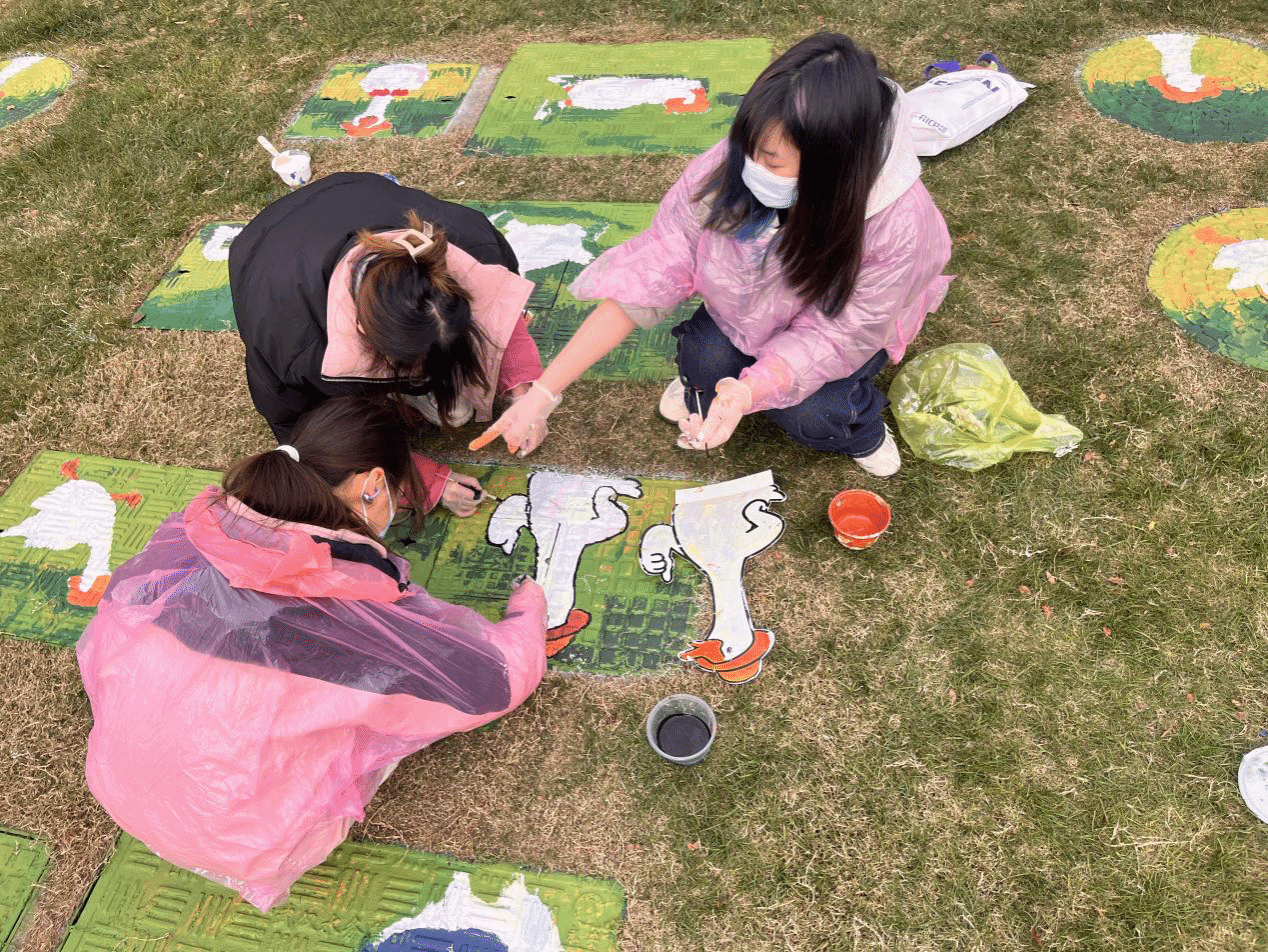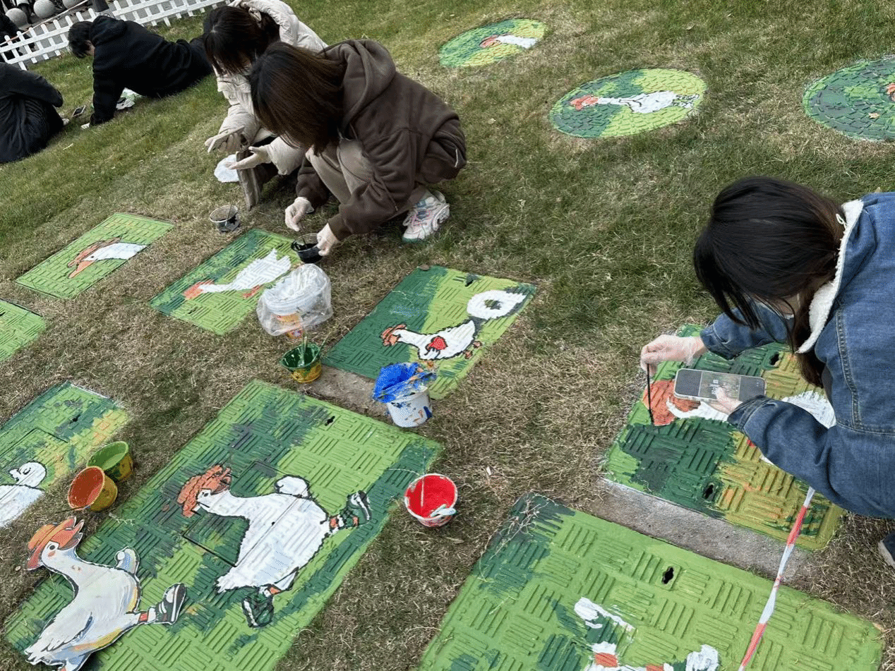 近日,创新设计学院观意工作室受托为武汉五环天地商业体打造的“续福鹅”主题公共艺术彩绘项目正式落地完工。该项目将商业体专属IP与城市公共设施有机融合,把原本单调的市政井盖转化为兼具文化内涵与艺术活力的景观节点,成为高校设计力量赋能商业场景、助力城市空间微更新的生动实践。