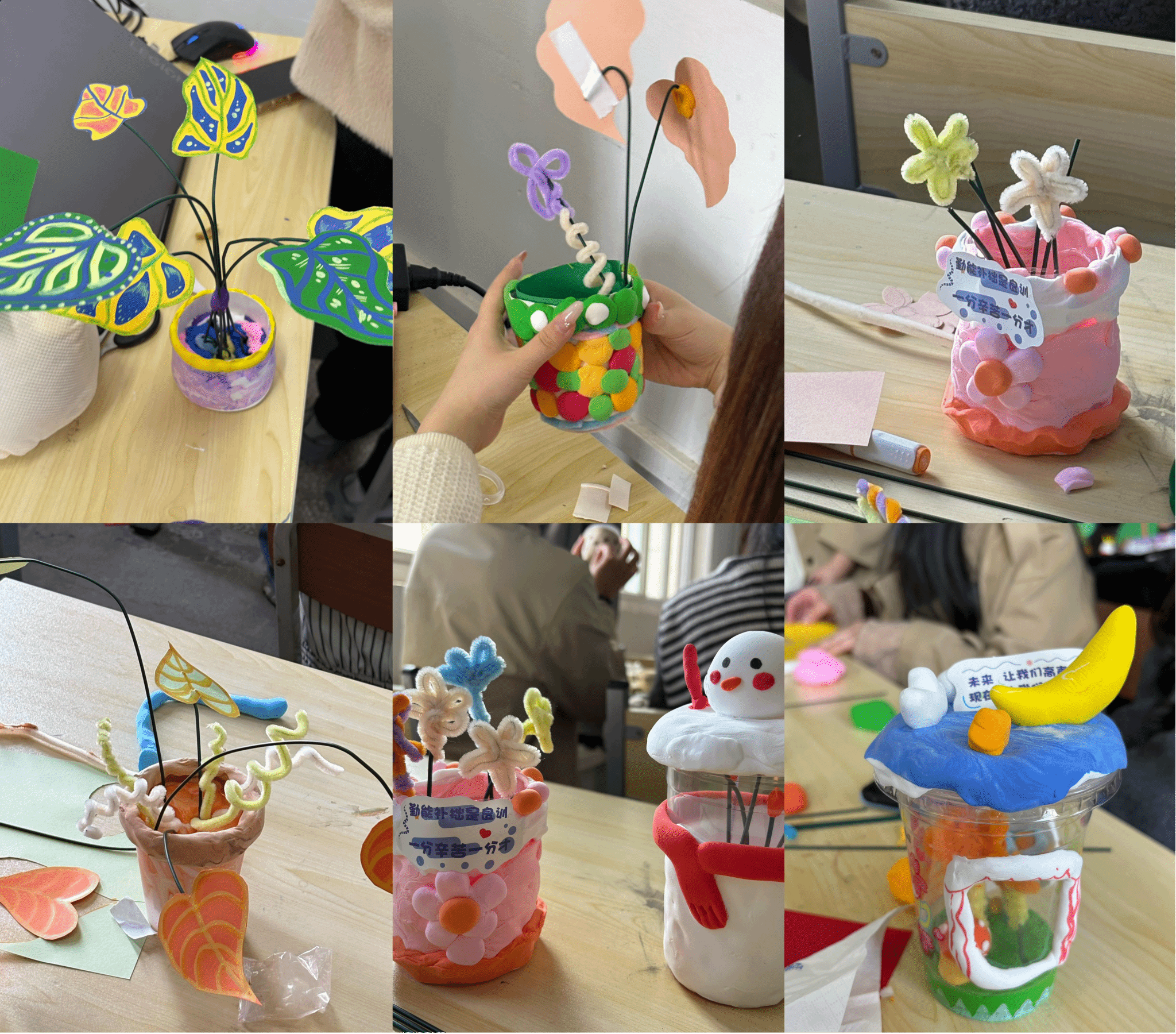 活动伊始,主持人以雷锋同志“勤俭朴素、艰苦奋斗”的事迹为引,讲述废物再利用与雷锋精神的内在联结,号召同学们以设计创艺焕新、用巧手践行节约。在创作环节,同学们充分发挥专业优势与想象力,将废弃奶茶杯、卡纸、粘土等材料巧妙组合,用粘土捏塑出憨态可掬的动植物造型,为普通花盆增添童趣,大家相互探讨协作,在交流中碰撞创意火花,原本被丢弃的废弃物在巧思与指尖下,逐渐变成一件件充满温度的艺术作品,生动诠释了“废物新生”的节约智慧。最后,在同学们的积极创作与志愿者们的共同努力下,活动圆满结束。