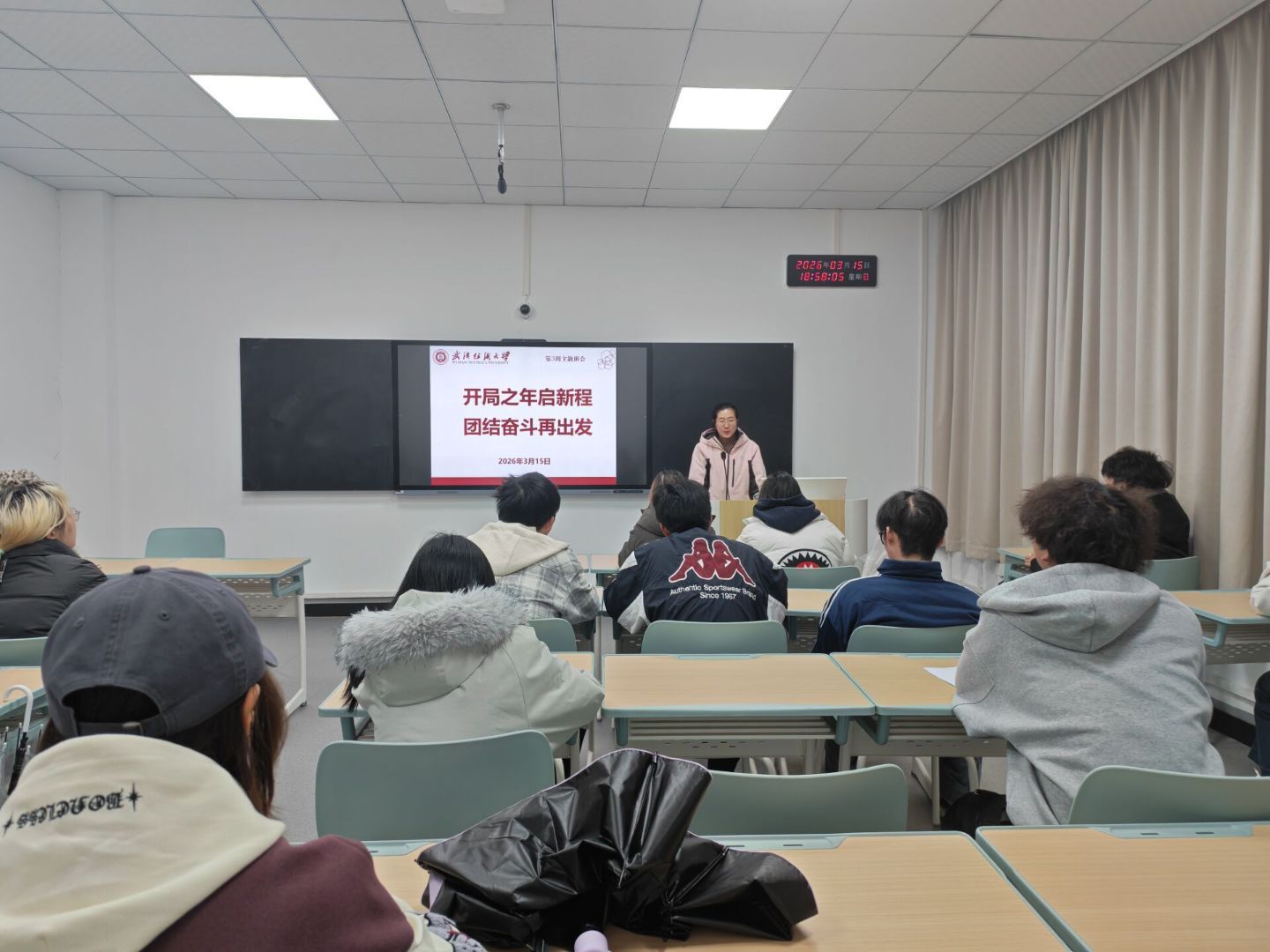 班会上,辅导员、班主任带领同学们深入学习2026年全国两会精神并强调2026年全国两会是在“十五五”开局之年召开的一次十分重要会议,习近平总书记在全国两会期间发表的一系列重要讲话,为推动“十五五”经济社会发展、做好开局之年各项工作指明了前进方向、提供了根本遵循。