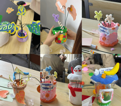 创作环节中,同学们充分发挥专业特长与想象力,巧妙运用废弃奶茶杯、卡纸、粘土等常见材料,精心构思、动手创作。大家或用粘土捏塑憨态可掬的动植物造型,为普通花盆增添灵动童趣;或用废旧卡纸剪裁拼接,打造兼具创意与温度的装饰摆件。创作过程中,同学们相互交流、彼此协作,在思想的碰撞中激发创意灵感,原本被丢弃的废弃物,在大家的巧思与指尖下,蜕变为一件件充满心意与温度的艺术作品,生动诠释了“废物新生”的节约智慧与设计魅力。在同学们的积极参与和志愿者的有序协助下,本次手工创作活动圆满落幕。