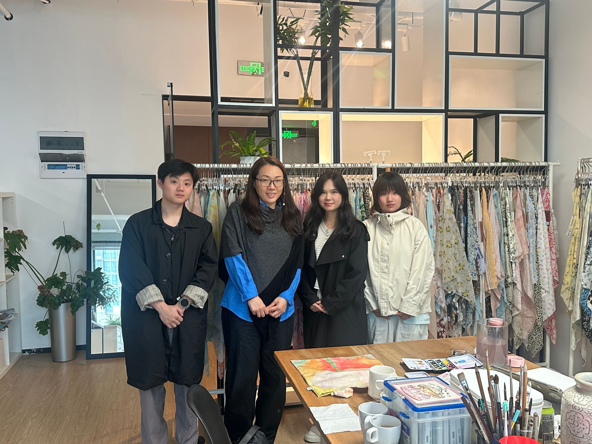 师生一行抵达企业后受到了负责人热情接待,师生们实地参观了工作室的创意设计区、作品展示区及制作工坊,近距离观摩了从创意构思、图案设计到成品落地的全流程,挂满各类印花面料的展示区、摆满画笔与工具的创作桌面,直观呈现了设计行业的工作场景与创作氛围,让同学们对专业知识的实际应用有了更具象的认知。